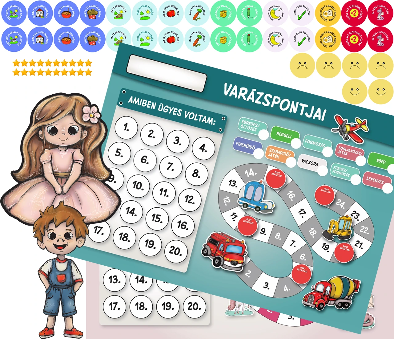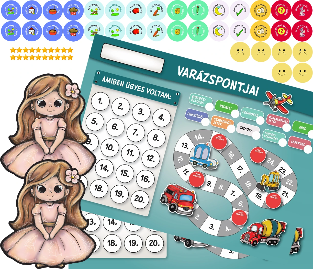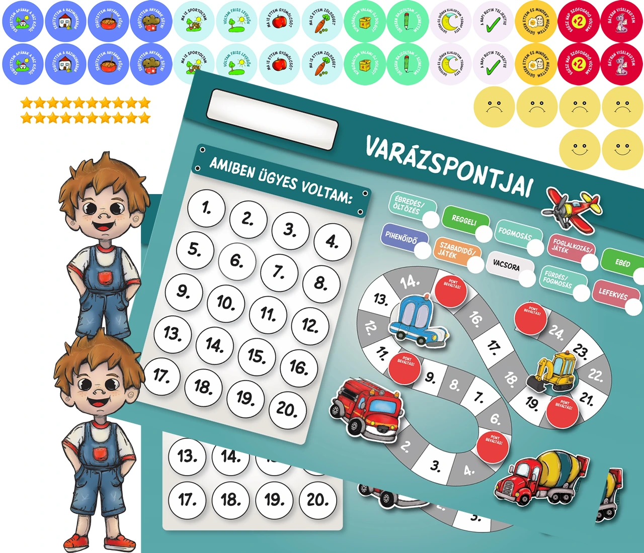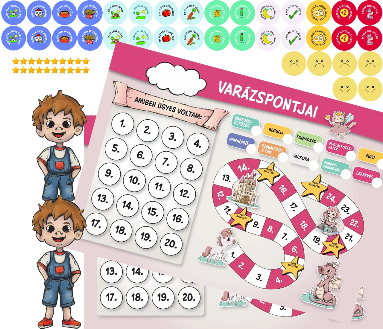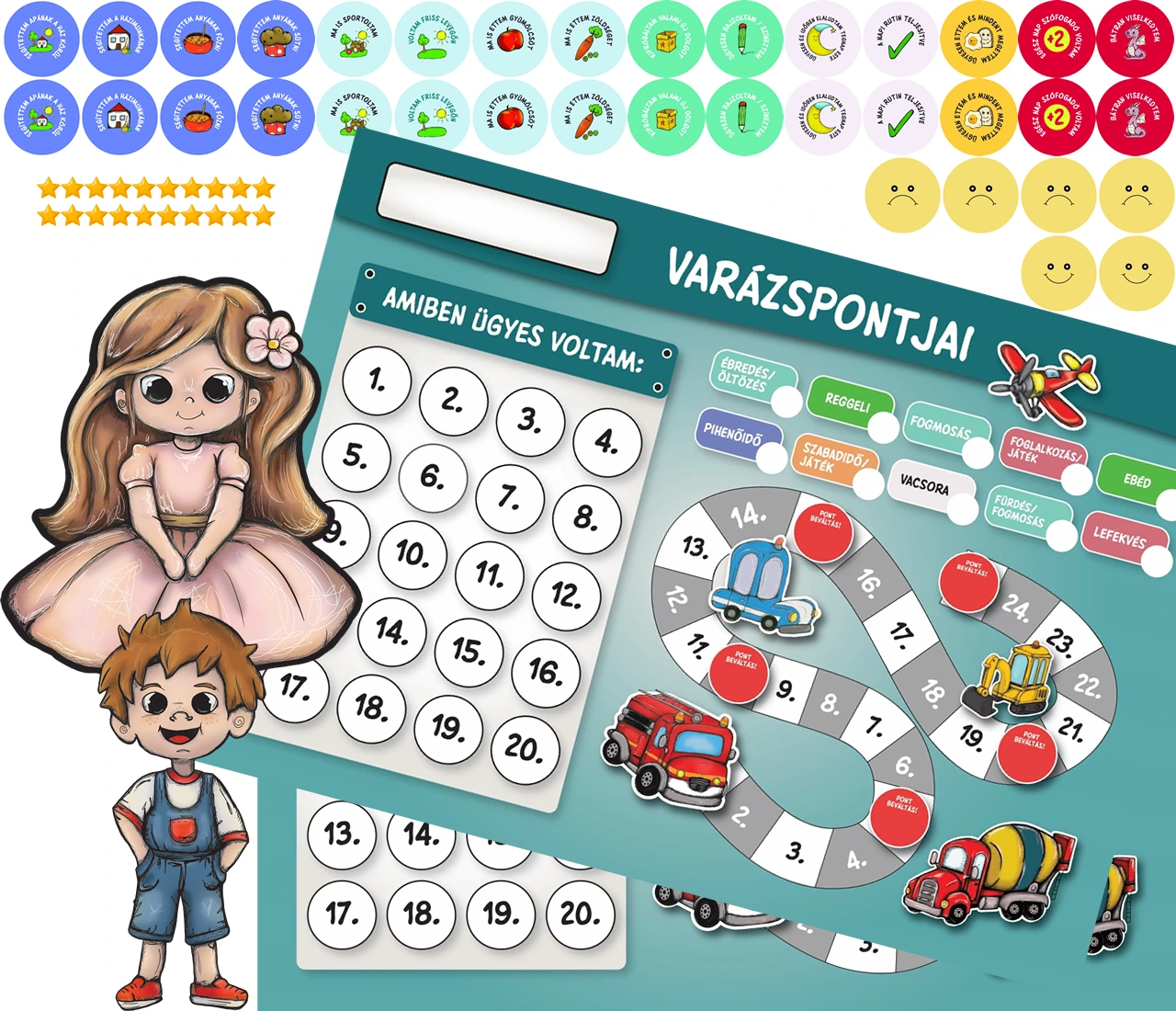 - 2 db mágneses játéktábla – a célok és jutalmak kalandos útja