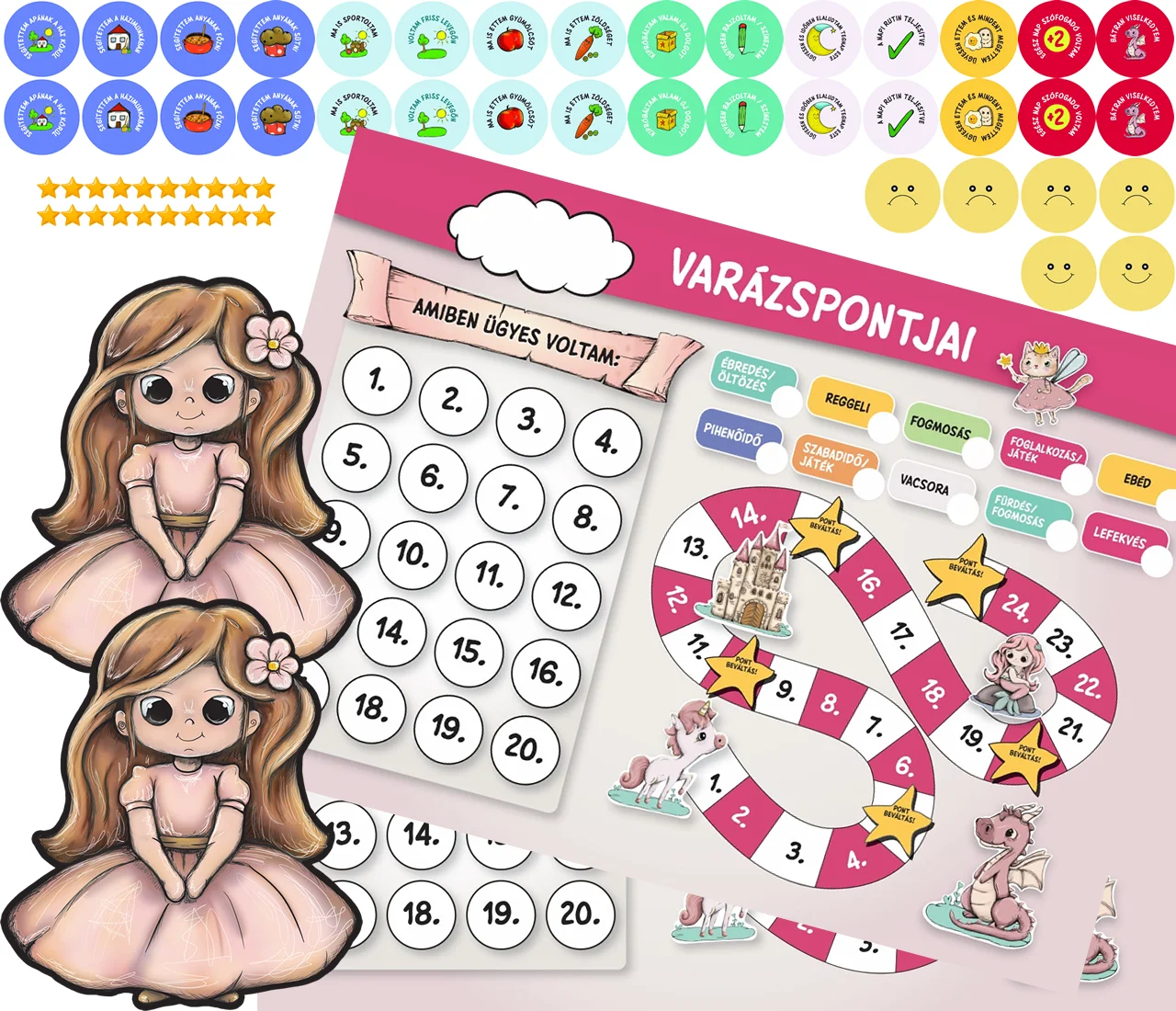 A szülő és gyermek együtt kitűzhet célokat – ezek lehetnek egyszerű napi feladatok vagy hosszabb távú kihívások. A gyermek minden teljesített tevékenység után matricát kap, és ha elér egy adott pontot a varázsmezőn, választhat egy jutalmat. Ez lehet közös meseolvasás, séta, finom süti, vagy bármi, ami számára értékes. A játék együttműködésre, következetességre és pozitív visszacsatolásra épül.